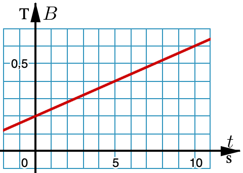 En kvadratisk slinga med två varv har sidan 0,05 m. Den befinner sig i ett homogent magnetfält som är vinkelrätt mot slingans plan. Den magnetiska flödestätheten BBökar med tiden tt enligt diagrammet.