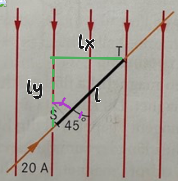 Vi komposantuppdelar ledaren så vi får en ly parallell med fältet och en lx som är vinkelrät. Det är enbart den vinkelräta som bidrar till kraften.