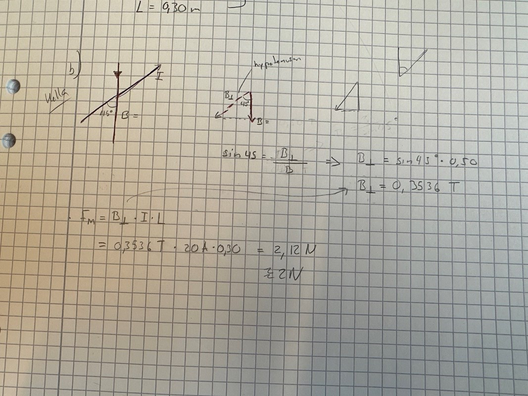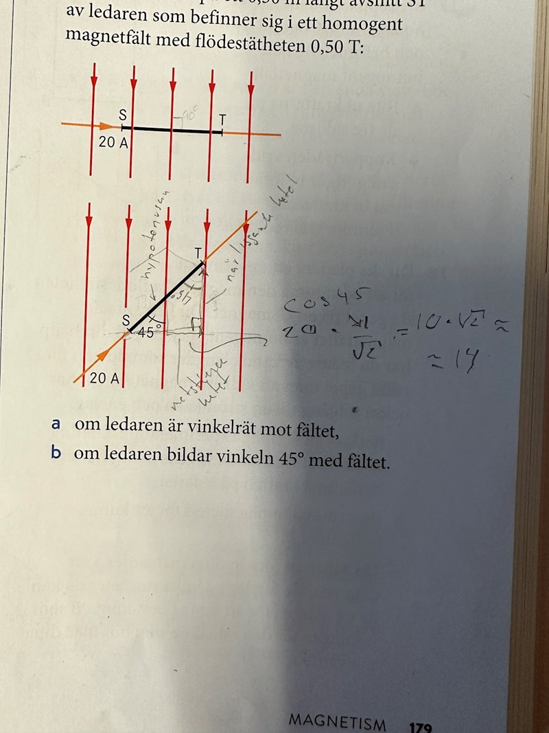 Vilken av fältet, strömmen eller längden du multiplicerar med sin(45) spelar ingen roll. Jag tyckte längden kändes rätt. Alltså att en kortare del av ledaren är vinkelrät. Man kan lika gärna säga att en mindre del av strömmen rör sig vinkelrät, eller att magnetfältet blir svagare.