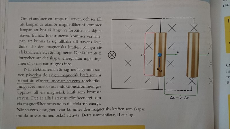 Ingen energi är "gratis", så när du rör staven i riktningen "v" i figuren, så känner du en kraft i motsatt riktning.