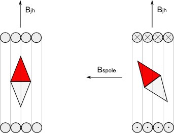 När strömmen slås på får man ett resulterande flöde som pekar i som kompassnålen.