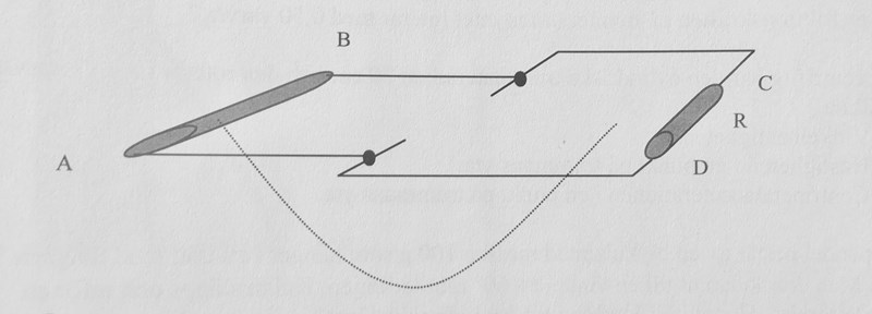En rak ledare AB med längden 25 cm är upphängd så att den kan röra sig som en pendel. I sitt nedersta läge har den hastigheten 1,6m/s åt höger. Vertikalkomposanten av jordens magnetfält är 50µT. Pendelanordningen är kopplad till en krets med resistansen 0,14 Ω.