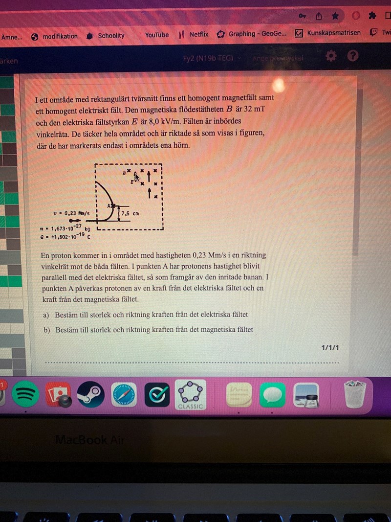 Hej jag har en fråga ang denna uppgift b. Jag förstår att man måste räkna ut den kinetiska energin och v vid punkten A men jag förstår inte varför man bara kan ta elektriska fältstyrkan*0,075 för att räkna ut ökningen i kinetisk energi jämfört med från början. Kraften från det elektriska fältet verkar ju inte hela tiden i protonens rörelseriktning fram till punkten a, bara delvis och som jag har förstått det måste en kraft vara i samma riktning som rörelseriktningen för att ett arbete ska ske. Jag förstår att elektriska fältstyrkan vid olika tillfällen kan delas upp i komposanter där en av dem är i rörelseriktningen men jag tänker att den kinetiska energin borde öka med mindre än elektriska fältstyrkan*0,075?