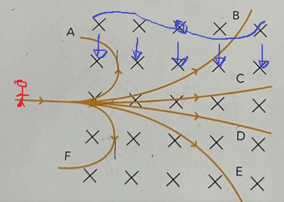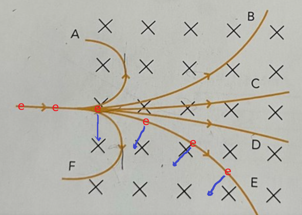 Elektronen kommer in i magnetfältet rakt från vänster. Som du redan konstaterat påverkas den av en kraft som pekar nedåt i bild. Om magnetfältet inte är så starkt som kommer banan inte att böjas av så mycket och då blir det alternativ D. Är magnetfältet starkare blir det E eller till och med F.