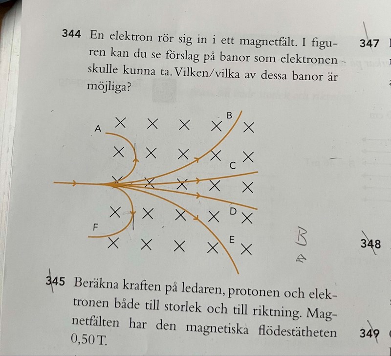 Uppgift 344. Jag förstår svaret på den här frågan men ändå inte... Jag använder tummen till strömmen som i detta fall blir i motsatt riktning (ström definieras ju som riktningen positiva laddningar skulle röra sig i – alltså motsatt riktning när det gäller elektroner). Fingrarna använder jag för magnetfältet som går in i pappret, då pekar handflatan som illustrerar den resulterande kraften nedåt. Men jag undrar varför det inte går att inkludera B och C i svaret eftersom är elektronen i de riktningarna som visas där så är den resulterande kraften också nedåt.