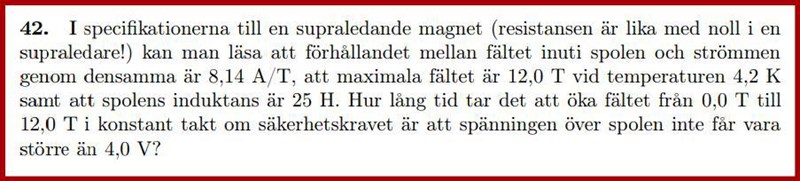 Situationen är alltså att vi vill inducera en (permanent) ström i supraledaren för att den ska ge upphov till ett magnetfält på 12T. Från början finns ingen ström och inte heller något magnetfält. Vi vill inducera ström m.h.a. en emf på max 4V under en okänd tid. Stämmer bra?