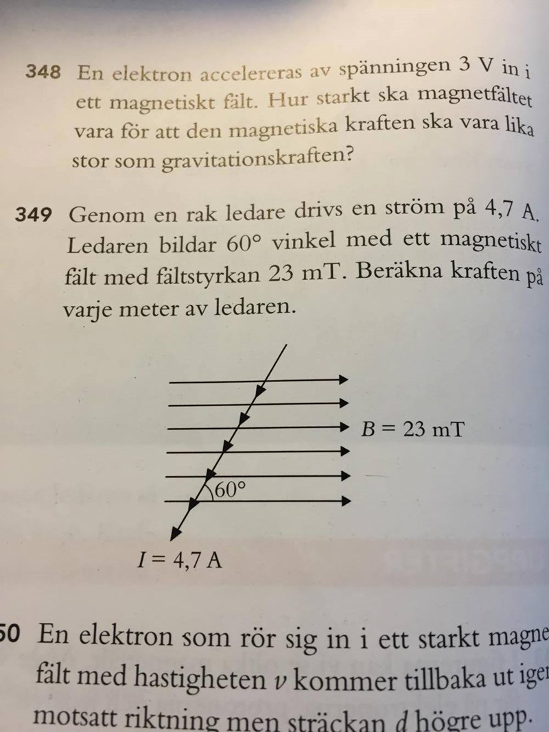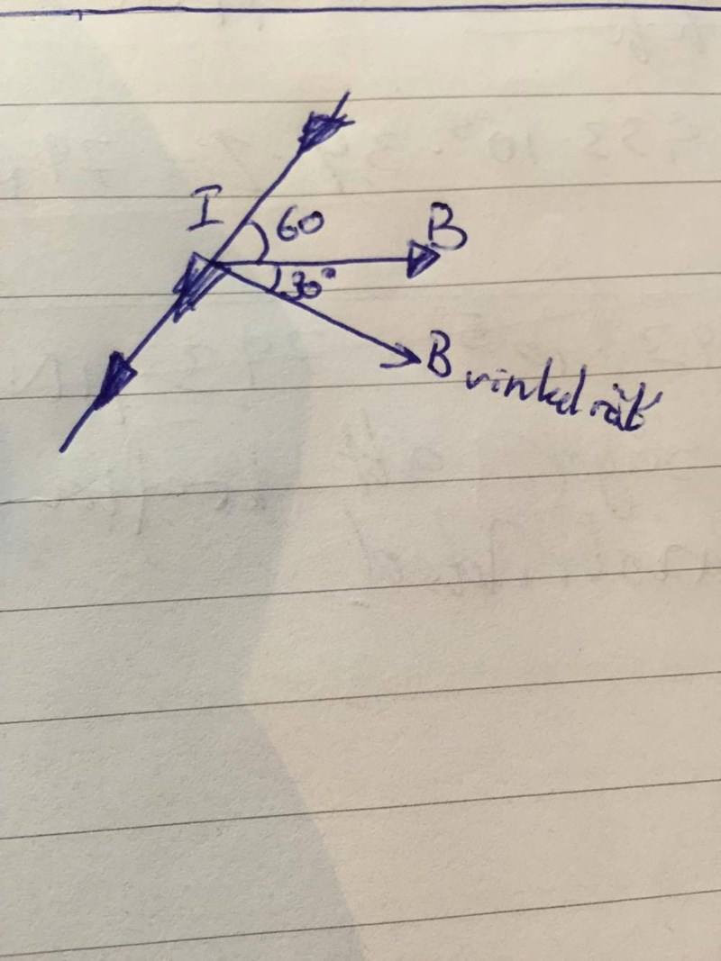 Dr. G skrev :B-fältets storlek är tydligen 23 mT. Hur stort är B-fältet riktat pallallellt med respektive vinkelrätt mot ledaren? Svaret får du när du komposantuppdelar.