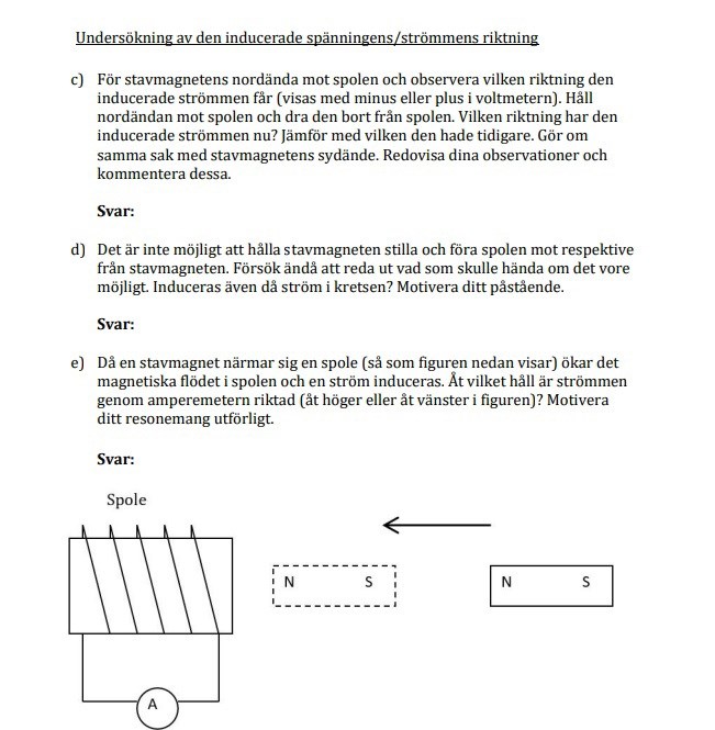 Fråga d: De vill att du ska resonera kring om det blir någon skillnad ifall man flyttar på spolen jämfört med om man flyttar på magneten, som i fråga c.