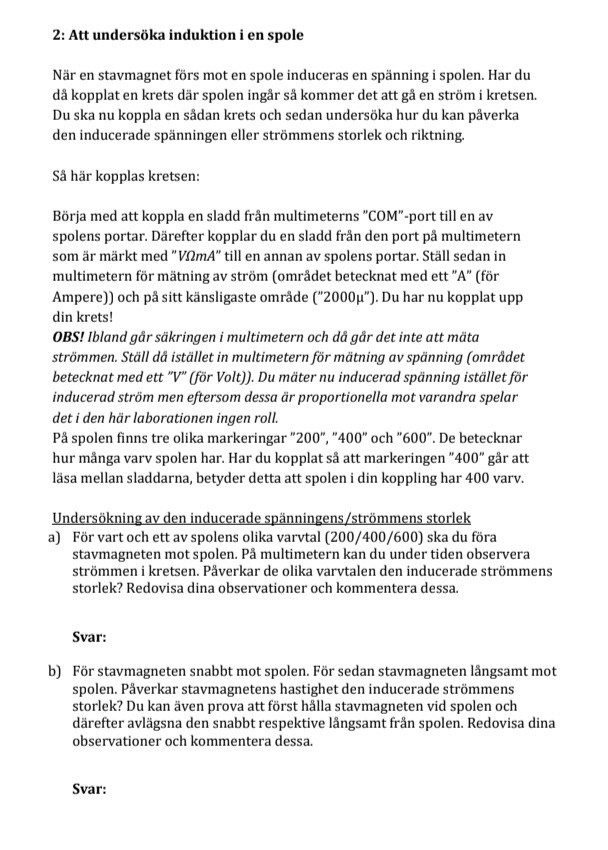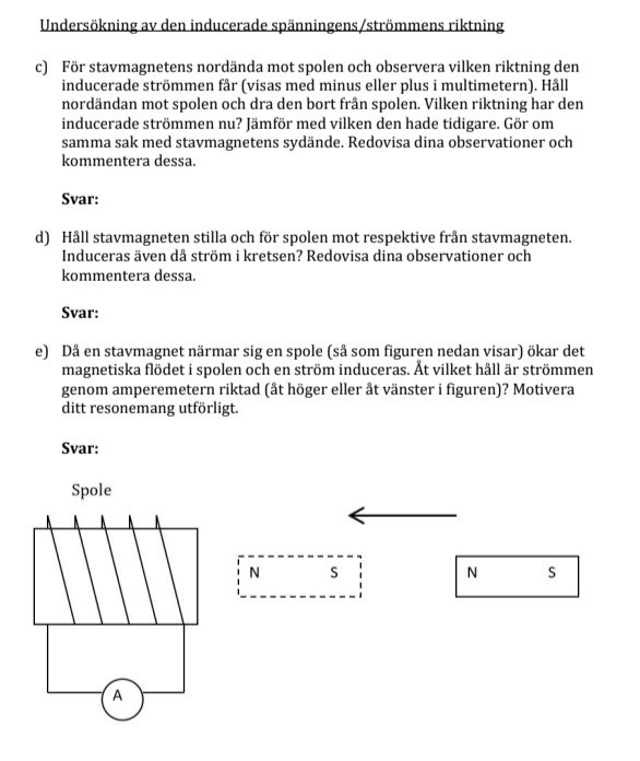 - 2e) när stavmagneten närmar sig spolen, varför ökar det magnetiska flödet i spolen och leder till ströminduktans? Hur vet man åt vilket håll strömmen genom amperemeter är riktad? Vi kommer ha digitala multimeter på labben, så jag vet inte om det vår kommer visa en ”riktning” så att säga.