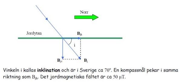 Du har en figur med ledningarna och sedan den här figuren på det jordmagnetiska fältet som ska hjälpa dig få fram komposant till det jordmagnetiska fältet som är vinkelrät mot ledarna på de olika sluttningarna.