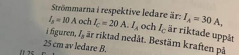 Denna regel beskriver i vilken riktning magnetfältet från en strömförande ledare går. Den regeln används i din uppgift för att räkna ut vilken riktning magnetfältet FRÅN ledare A har i positionen där ledare B ligger. Den regeln används också för att räkna ut i vilken riktning magnetfältet FRÅN ledare C har i positionen där ledare B ligger.