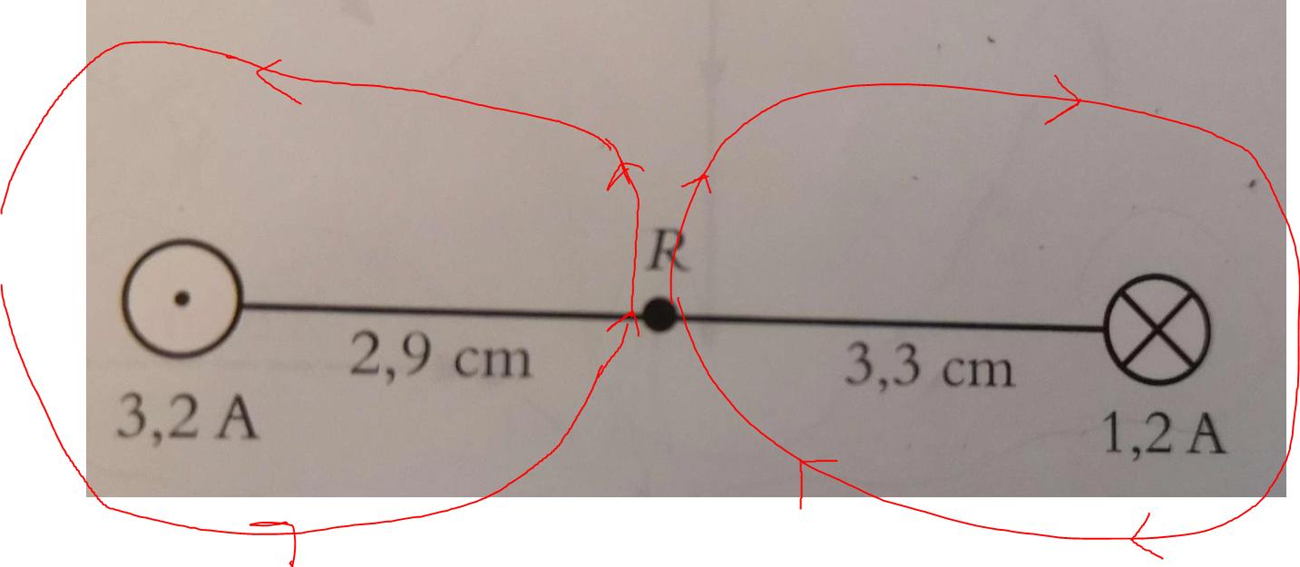 Jag ska beräkna den magnetiska flödestätheten och magnetfältets riktning i punkten R. Har jag tänkt rätt som i bilden? Jag tänker att om jag gör högerhandsregeln på vardera ledare och sedan blir väl flödestätheten adderat i och med att deras magnetsfältsriktning är samma i punkten R eller?