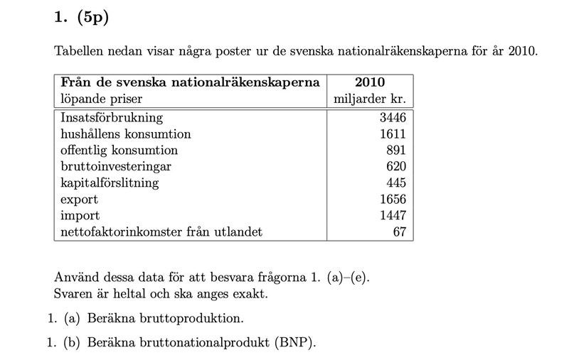 Jag har försökt beräkna BNP (1.b) men har fastnat helt, jag verkar inte lyckas få fram samma svar (3331) som det står i facit. Jag har använt mig av denna formeln