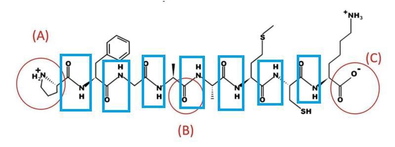 Det viktiga här är att inse att du har peptidbindningar (inritade i blått). Dessa binder ihop aminosyror till proteiner, men när man har så pass få aminosyror som sitter ihop kallas det inte för protein utan för oligopeptid.