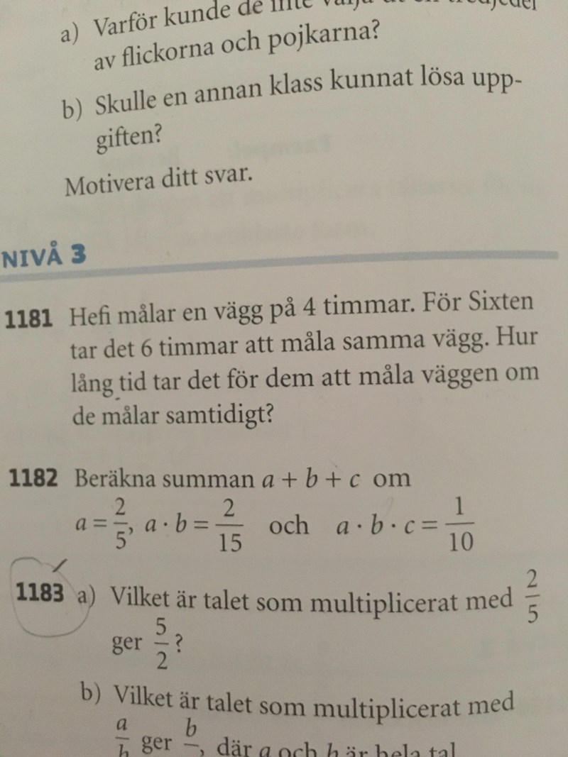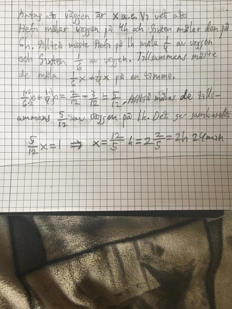 Men sedan får du inte bara ta bort x. Du börjar med och då får du inte bara glömma x. Gör om den och behåll x (du får svaret ), men din slutsats blir fortfarande "Alltså målar de tillsammans 5/12 av väggen på 1h".