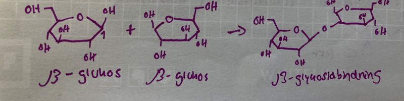 Exempelvis i denna här har jag ritat bildningen av en disackarid av två beta-glukos. Jag förstår då att det blir en beta-glykosidbindning då det är en reaktion med två betaglukos men vad blir det om kol 1 båda glukos reagerar med varandra (och en glukos är alfa och en beta)? Jag har även lite svårt att förstå hur man vet vilket kol som är kol 1. Och hur blir detta tre sockerrester?