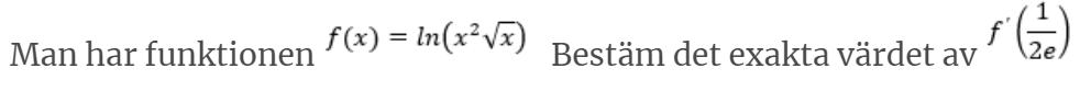 Tomten skrev:Nej, dubbelbråket måste bli 5/2x och dit kommer man ännu enklare genom loglagen: ln(x2sqr(x))=ln(x2,5)=2,5ln(x), Derivatan erhålls sedan utan kedjeregeln och annat som f’(x)=2,5/x vilket är samma som ditt resultat.