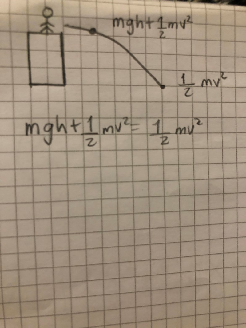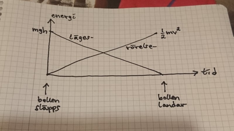 Är du med på att om man släpper en sak från höjden 10 m så är lägesenergin och rörelseenergi lika stora när saken har fallit 5 m, d v s halvvägs?