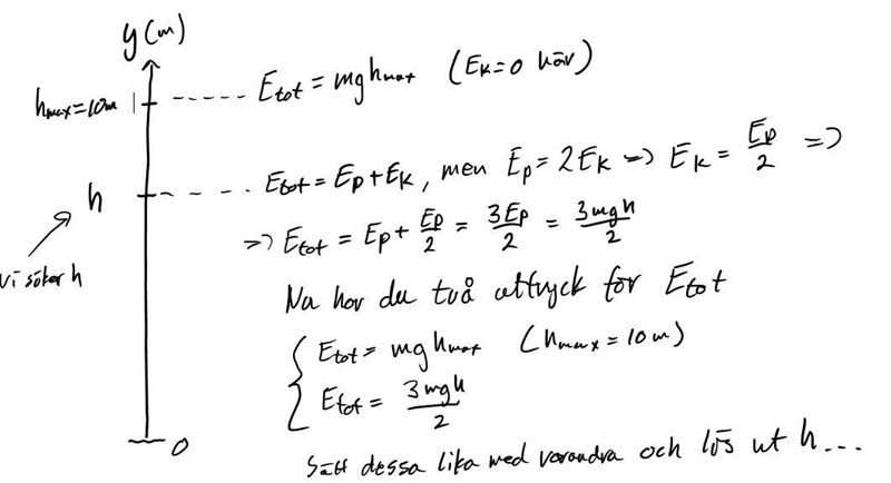 Titta igenom punkterna på min lista igen. Det verkar som om du inte är med hela vägen. Du behöver inte räkna ut rörelseenergin. Man frågar bara efter på vilken höjd som lägesenergin är dubbelt så stor som rörelseenergin.