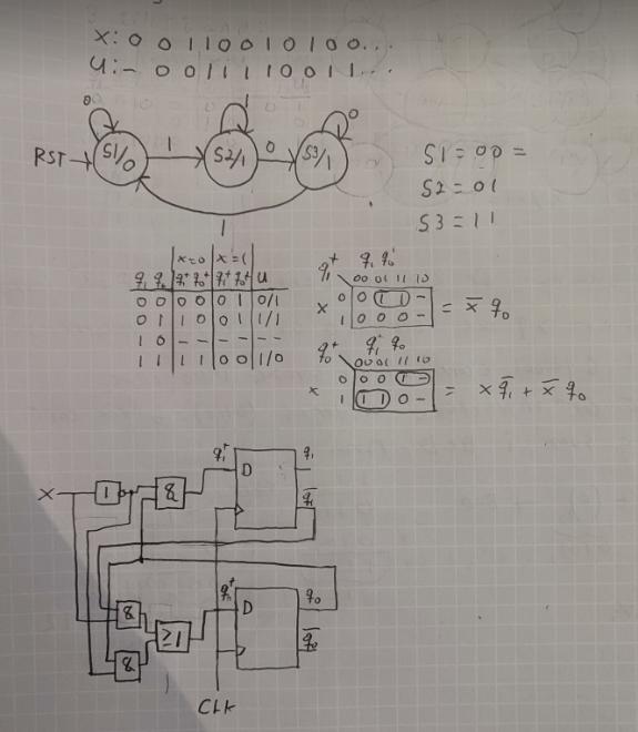 Man vill tillverka ett synkront sekvensnät som har en 1-bits digital insignal X och en utsignal U