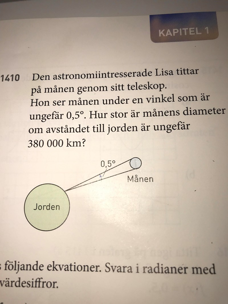 Jag tänker såhär: Rita en cirkel med jorden som origo som når månen. Månen täcker 0.5° av 360°. Då är månens bredd lika med: