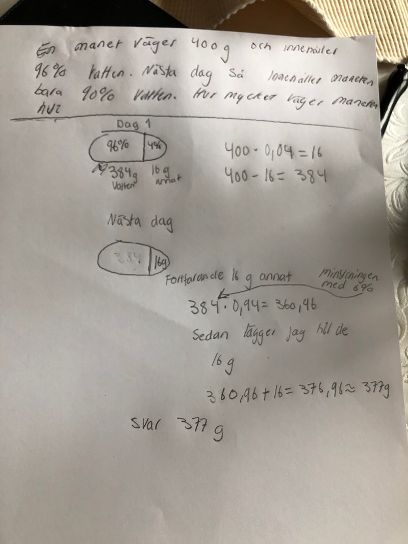 sofi739 skrev:Hej! Har försökt lösa denna uppgiften men vet inte om jag har kommit fram till rätt svar. Den lyder såhär: En manet väger 400g och innehåller 96% vatten. Nästa dag innehåller maneten bara 90% vatten. Hur mycket väger den nu?