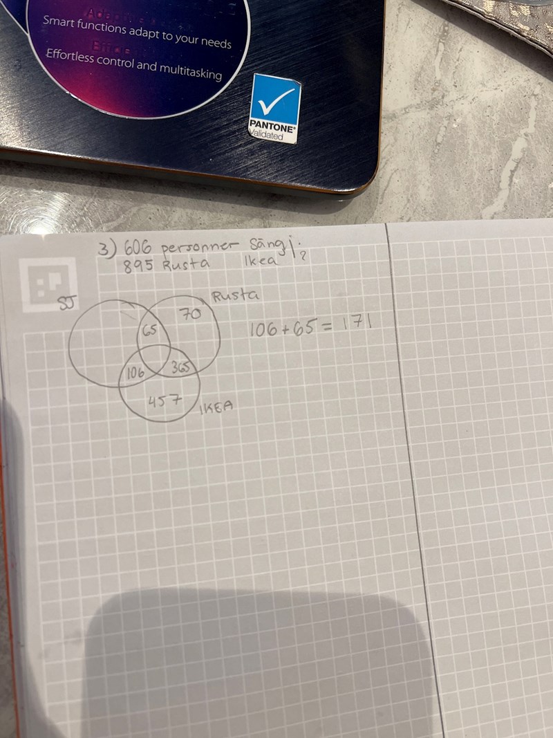 Jag misstänker att man bör räkna ut först hur många som besökte alla tre, men vet helt ärligt inte hur jag ska göra. Jag har börjat lite men sen insåg jag att det inte är så lätt
