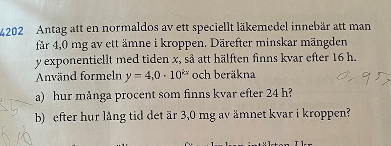 a) y= 4 * 10^(-0,018*24) = ungefär 1,479. (1,479/4)*100 = ungefär 37 procent kvar efter 24h.