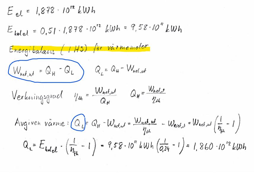 Sätt in värdena för elproduktionen från kolkraft (Ekol) och verkningsgraden för att få den tillförda värmen: