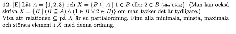 Som jag uppfattar det på frågan är X mängden av B som är en delmängd i A={1,2,3} då B innehåller 1 och/eller 2 men inte 3. Men då förstår jag inte varför man i facit (andra bilden) inte bara skriver X={{1}, {2} ,{1,2}}. I lösningen inkluderar de 3:or i elementen trots att 3 inte ingår i X.