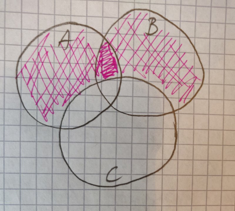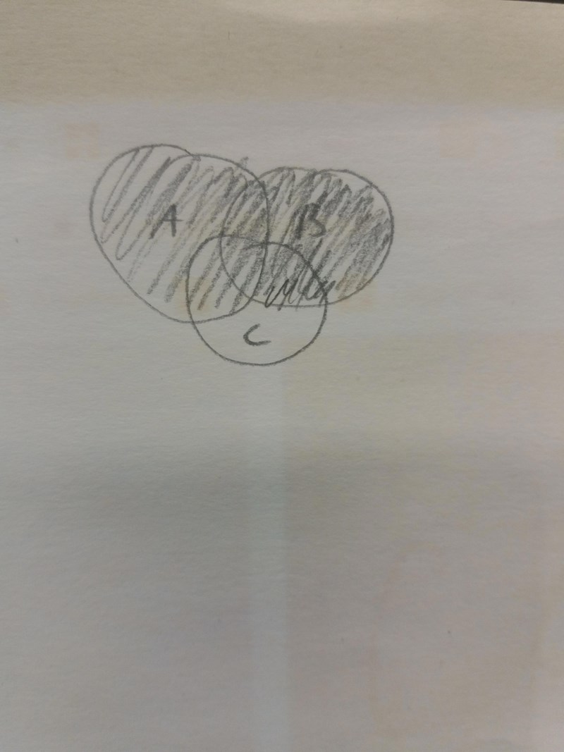 Du ska ha med komplementet någonstans också, men om vi tar ett steg i taget så är det inte A union B du har markerat i förra bilden. Det är snarare ungefär A snitt B, men varför får elementen i C inte vara med?