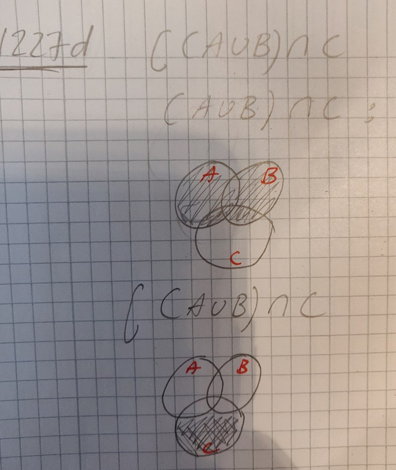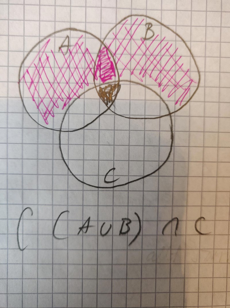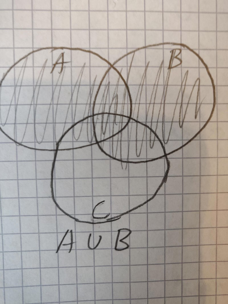Nej, det är det här som är unionen mellan A och B (allt som ingår i A eller B eller A och B). Kan du rita en bild som visar vad som ingår i (AUB) och i C?