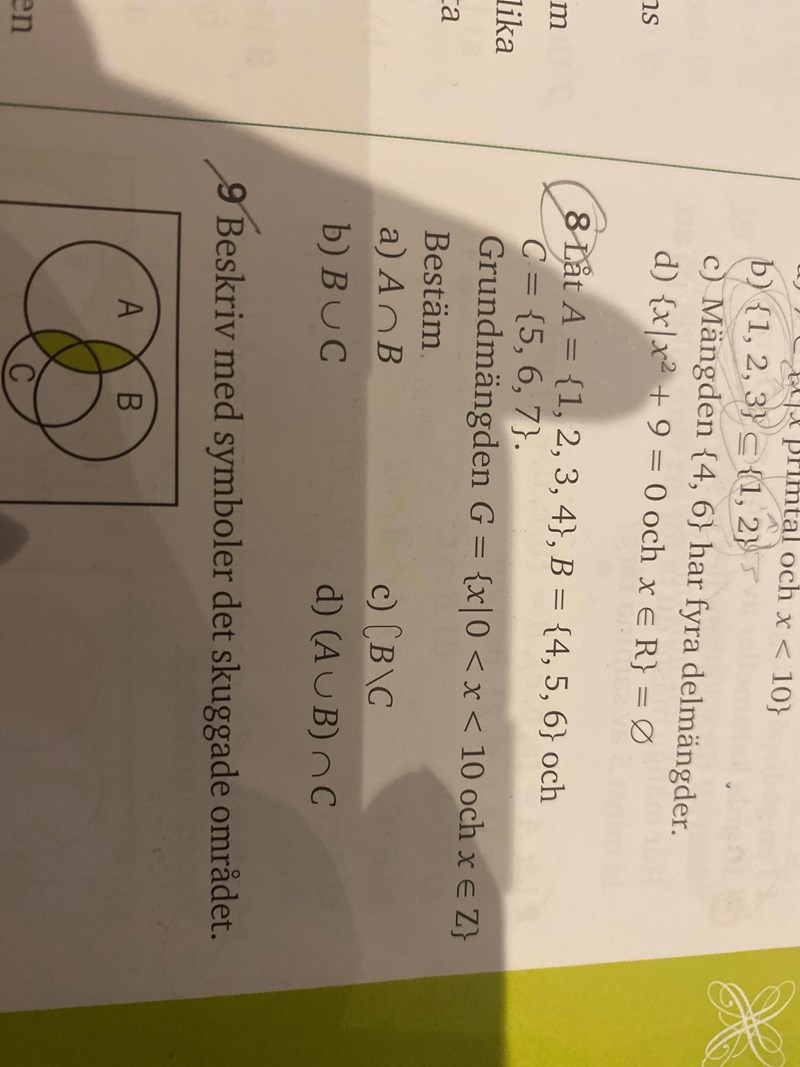 Hej, skulle behöva hjälp med att förstå varför svaret på 8c är {1,2,3,8,9}. Jag trodde att svaret skulle bli {1,2,3,4,7,8,9} då B\C är {5,6} och då borde väl komplementet till detta vara alla siffror förutom 5,6??