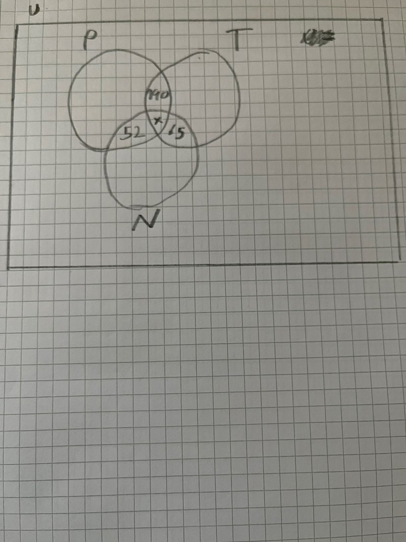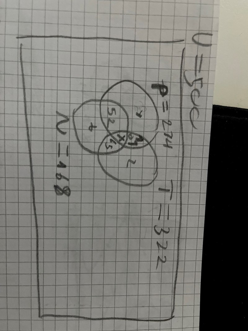 Det här stämmer väl inte. Snittet mellan P och T borde vara 190; så som du har skrivit det har du förutsatt att ingen i snittet mellan P och T även är en del av N. På samma sätt med snittet mellan P och N samt snittet mellan T och N; siffrorna för dessa borde även innefatta snittet mellan P, T och N.