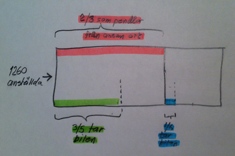 "på ett stort företag som har 1260 anställda pendlar 2/3 till jobbet från en annan ort. av de som pendlar är det 3/5 som tar bilen till jobbet och av de som inte pendlar är det 1/6 som kör bil till jobbet. hur stor andel av dem som kör bil till jobbet är det som också pendlar från en annan ort?"