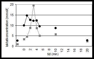 Kalle fick springa upp och ner i trappan i 5 minuter. Under samma tid fick Erik stå med böjda ben, mot en vägg. Innan försöket, samt efter och under 20 minuter framåt togs blodprov i armen på bägge två. Halten laktat i blodet analyserades och ritades upp i ett diagram. Den första punkten i varje kurva motsvarar laktathalten i blodet innan försöket startades och den andra (vid tiden 0 min) är direkt efter utförd ”övning''.