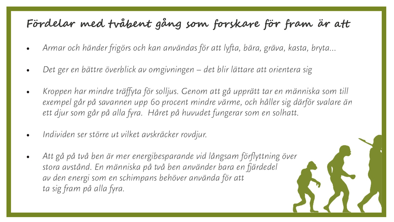 Vad är fördelarna med att människan kunna gå upprätt? Jag tänker typ att man fick fria händer och kunde hålla spjut o jaga, bättre sikt, se större ut för sina fiender och kanske att man får mindre solljus på sig (dock var är fördelen med det?) vad mer finns det?