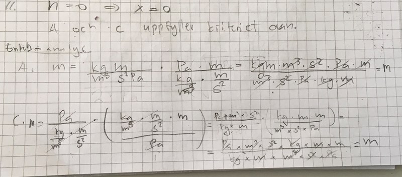 Dr. G skrev :Om h = 0 så bör x också vara 0, vilket ger A eller C. Dimensionsanalys på första faktorn ger C.