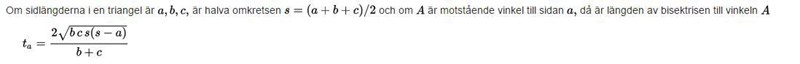 Lirim.K skrev :Här finns två exakta bevis för härledning av bisektrisens kvadrat, ifall någon är intresserad. https://proofwiki.org/wiki/Length_of_Angle_Bisector.