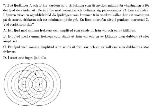 Dr. G skrev :Ljudet från de två källorna har samma amplitud och är i motfas i punkten C, så de tar helt ut varandra där, så svaret är D.