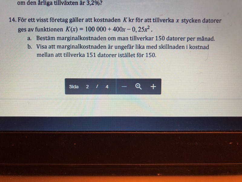 Vad jag har förstått så ska jag derivera funktionen för att ta reda på marginalkostnadens funktion, och sedan sätta in x= 150. Jag får då svaret 325, men enligt facit är det 399.25, vilket jag inte förstår hur?