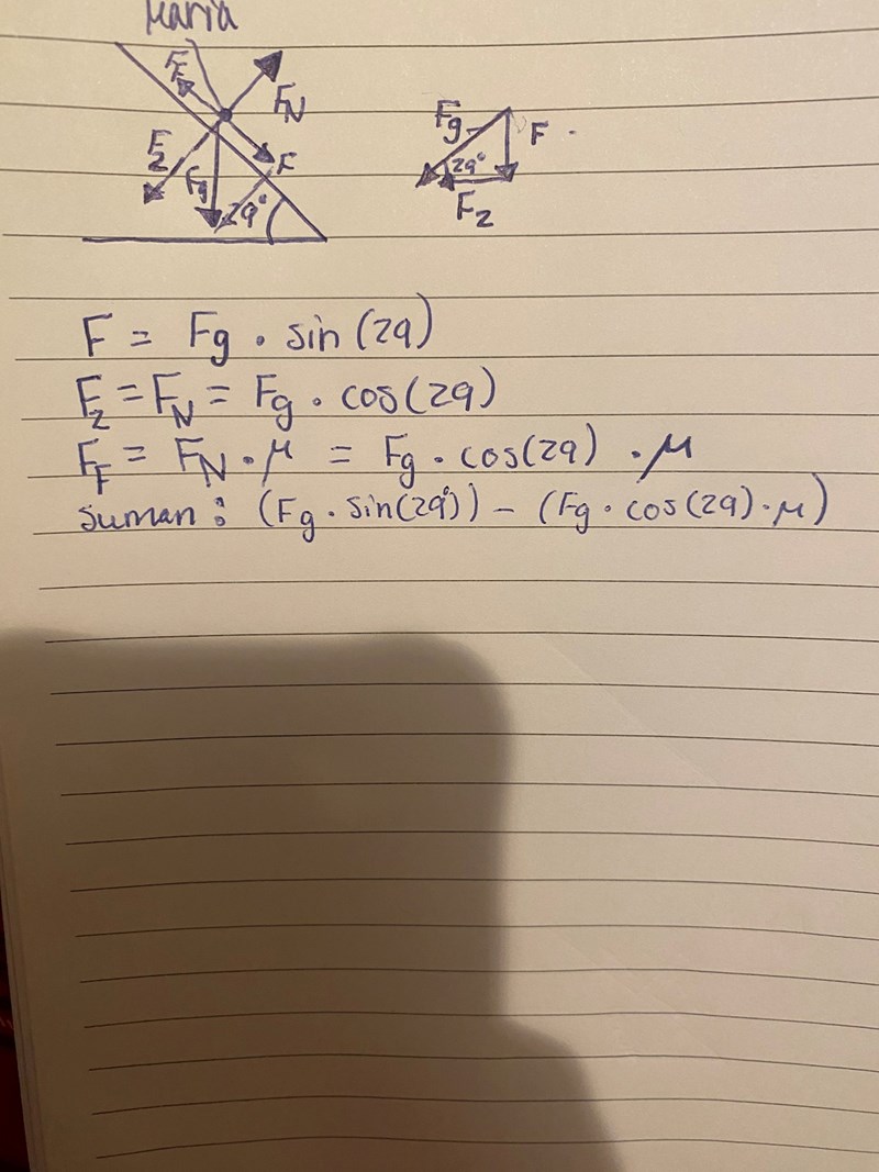 mg * sin(29) - mg * cos(29) *μ är summa krafter