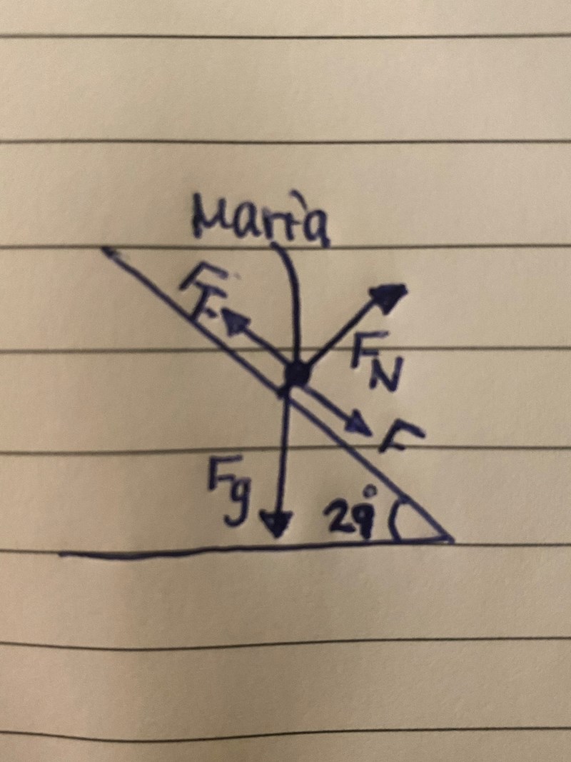 Maria är ute och cyklar när hon kommer till en brant nedförsbacke. Hon trampar hårt på bromsen men cykeln glider nedför backen. Backen lutar med vinkeln 29 grader och friktionstalet mellan underlag och däcken på Marias cykel är 0,5.