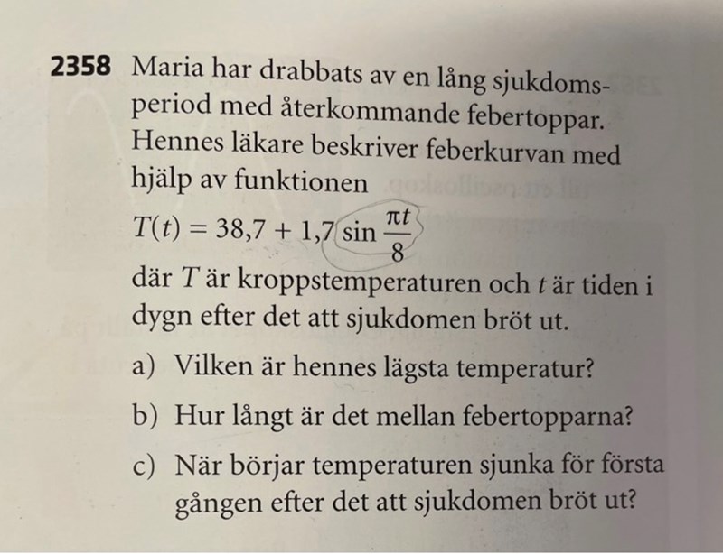 Jag undrar ifall jag har tänkt rätt i a&b? Och även hur man ska tänka i c frågan för där får jag fel svar. I c tänkte jag att efter att Maria har nått sin högsta temperatur så bör temperaturen sjunka. Hennes högsta temperatur är 38,7+1.7=40.4, det man kan sen göra är att sätta in y=40,4 och lösa ut t.. Men jag tänker att man kan också tänka att då sin(pi/8 *t)=1 är temperaturen som högst .. men jag får fel svar