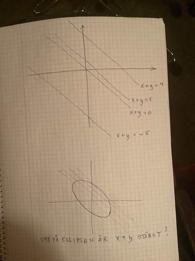 (Gradienten till nivåkurvorna är vinkelrät mot tangenten, den pekar alltså åt nordost och kan skrivas (1, 1). Tittar man på gradienten till ellipsuttrycket gäller det att få det på formen (t, t) och då faller allt ut hur snällt som helst. Men du har inte kommit till gradient, så vi skippar det. Fast maximiproblem med bivillkor innan man mött gradienter förvånar mig :)