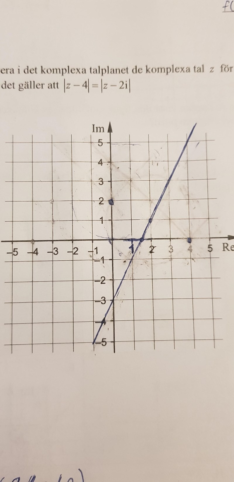 Markera i det komplexa talplanet de komplexa tal z för vilka det gäller att |z-4| = |z-2i|