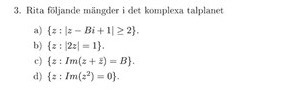 Hej! Jag vet hur man avgränsar ett område i det komplexa talplanet men blir väldigt förvirrad när B inte är definierad. Jag förstår att a) och b) kommer bilda en cirkel med radien 2 respektive 1 men vet inte var i talplanet jag ska placera ut mittpunkten. Uppgift c) och d) förstår jag mig inte på alls.