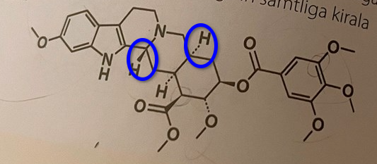 De atomer som har streckade linjer o linjer som blir tjockare indikerar att atomen ligger under bildplanet sett från dig resp. över bildplanet. Det är 6 chirala kol.