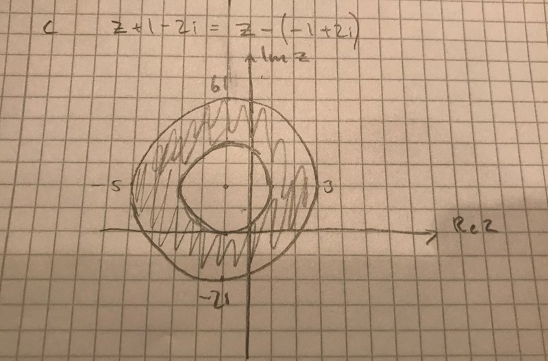 Jag tänker att cirkelns mittpunkt bör ligga i -1+2i eftersom det är de siffror jag ska subtrahera från z för att få z+1-2i...