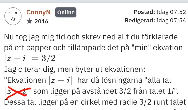 ConnyN skrev:Aha! Vilken bra förklaring. Nu föll poletten ned. Trots att jag var det på spåren i två läroböcker, så förstod jag inte deras korta förklaring. För mig var z en vektor i det komplexa talplanet, men innanför absolutbeloppet blir det då endast ett tal, men borde det då inte egentligen stå ?